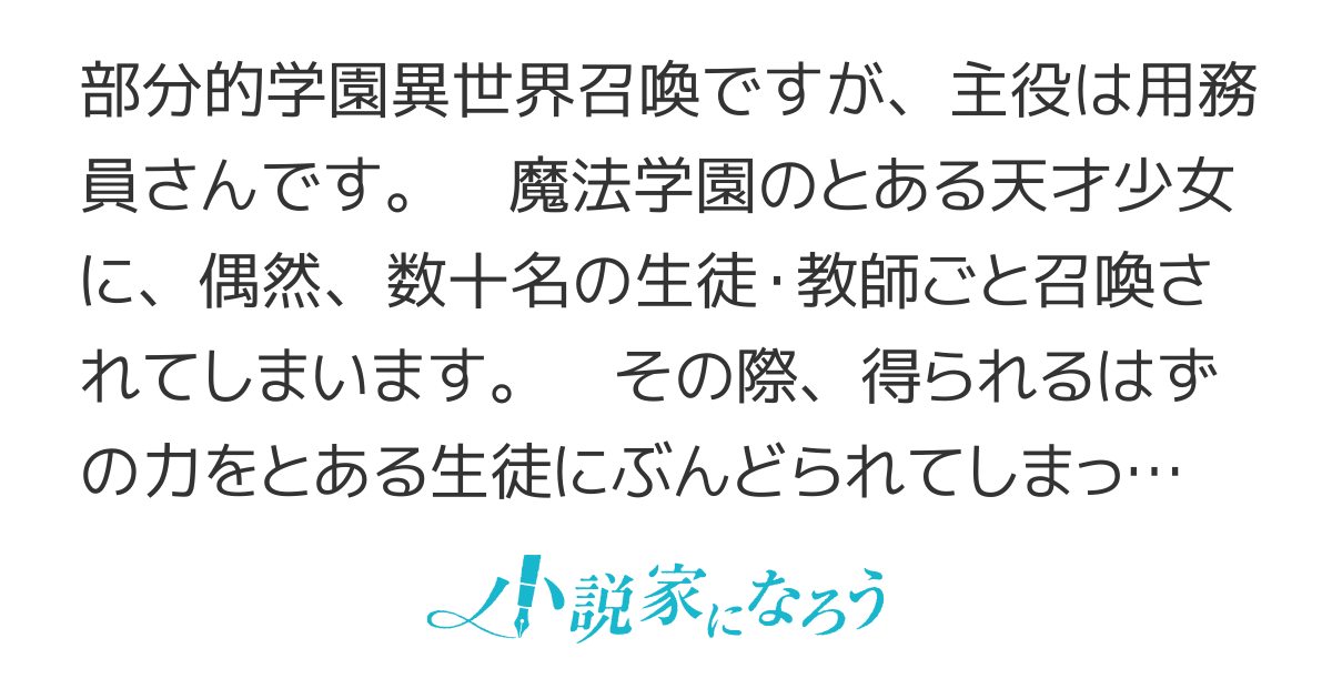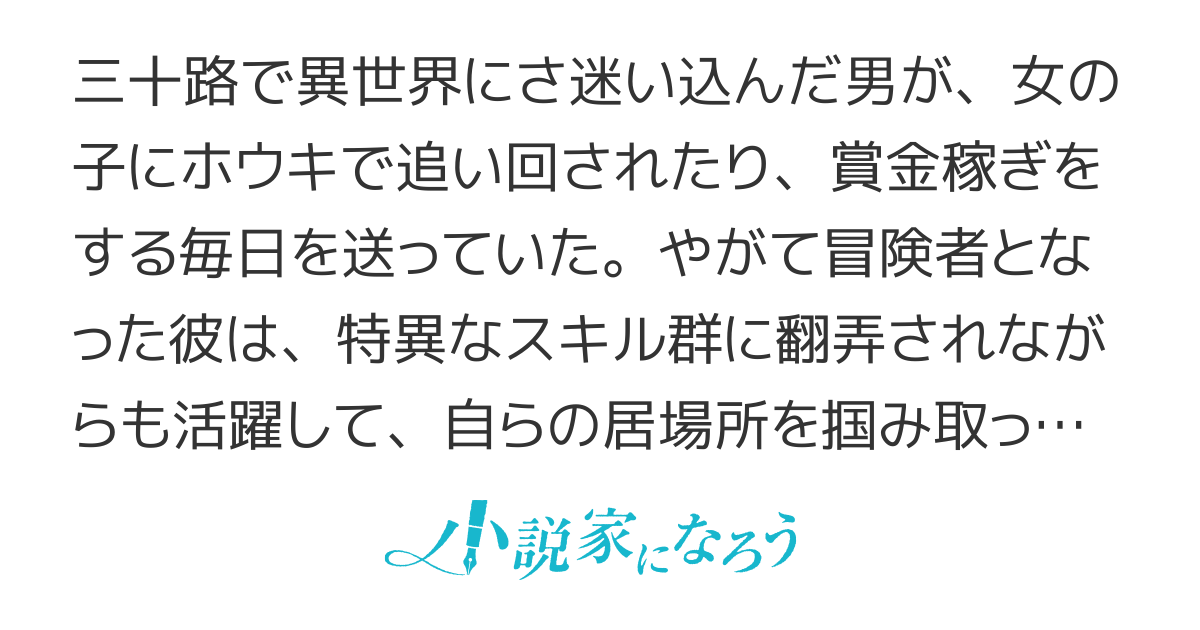 なさけないおじさんが主人公です。ですが、侮ることなかれ。文章もストーリーもしっかりしていておじさんも大活躍?です。こんな主人公を待っていた。おじさんなら誰しもそう思うことでしょう。おじさんの星と言っても過言ではない。がんばれおじさん。全163話連載中。
