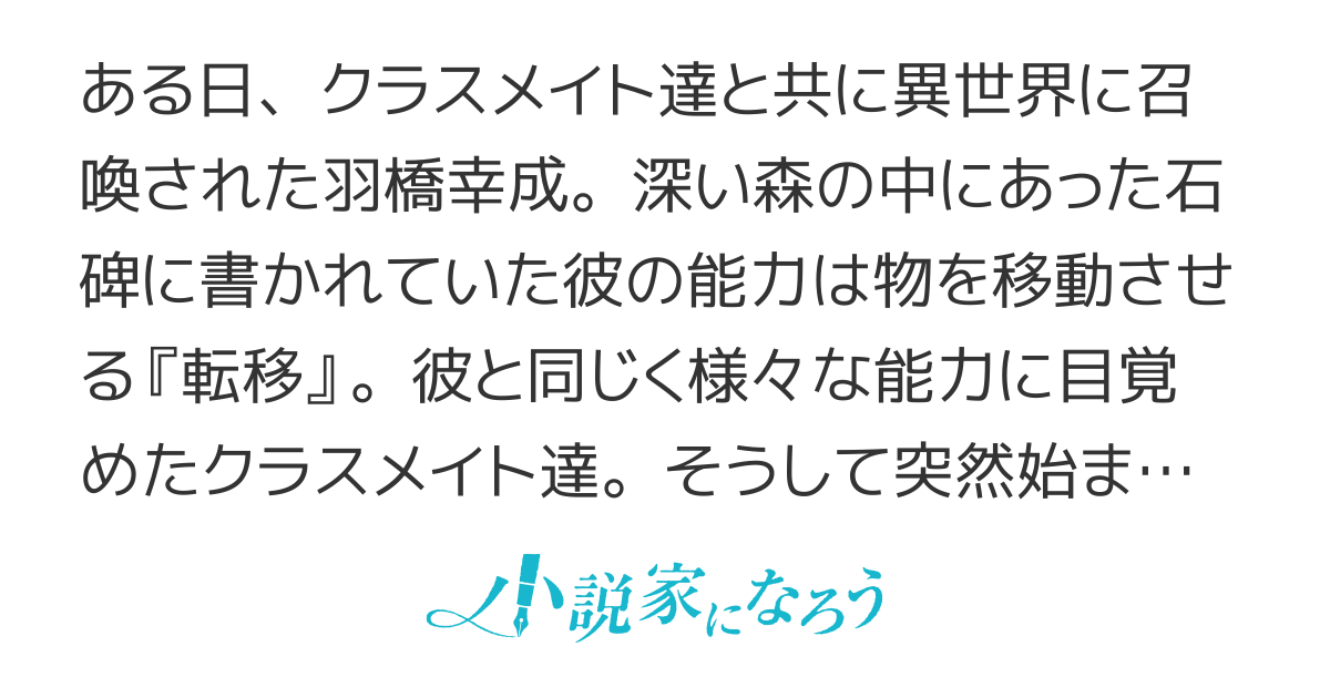 よくできたクラス転移ものです。主人公だけは地球に帰れますが友達を助けるために異世界での生活を続けます。転移後しばらくするとクラスメイト同士でバトルロイヤル形式のデスゲームの様相を呈するようになり。全233話完結済み。
