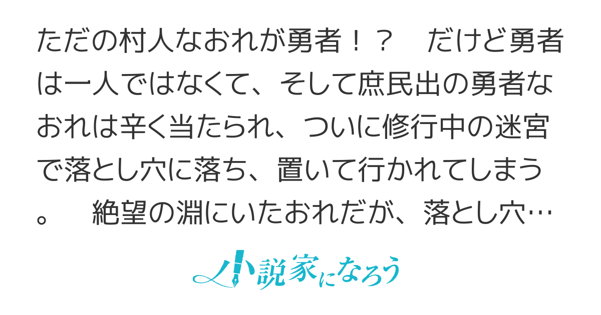 勇者の中でひとりだけ身分の低い主人公は、疎まれて迷宮の穴に落とされます。主人公は死にたくない一心で深層へ向かい、常に死と隣り合わせの長期間の迷宮の探索で力を得て見事に帰還します。近くの村で村人に助けられ恩返しをしようとしますが、そこから数奇な運命が巡り始めます。とても良く出来たストーリーです。全265話連載中。